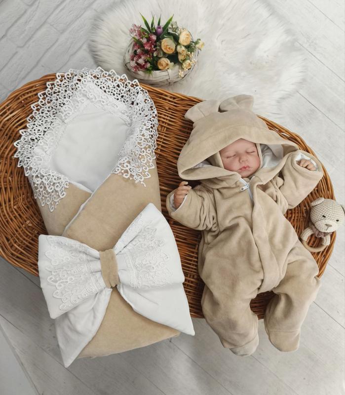 Комбинезон с шапочкой Размер- 0-3 месяцев Велюр-верхняя часть Подклад- хлопок белого цвета Ручка открывается и закрывается Конверт- с кружевом Зъемный наполнитель-11еконизированное волокно Подклад- белого цвета Размер- 80*80 см