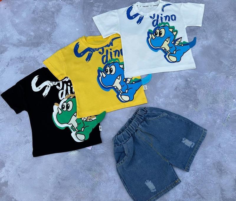 Стильний костюмчик Якість хороша!! Пояс на резинці! Футболка+джинсові шорти! Заміри: Розмір 80 футболка - довжина 35 см, ширина 30 см шорти-довж -27 см, пояс - 21 см Розмір 100 футболка - довжина 38 см, ширина 32 см шорти-довж -30 см, пояс - 23 см Розмір 110 футболка- довжина 41 см, ширина 33 см шорти-довж -31 см, пояс - 24 см Розмір 120 футболка- довжина 42 см, ширина 34 см шорти-довж -32 см, пояс - 25 см
