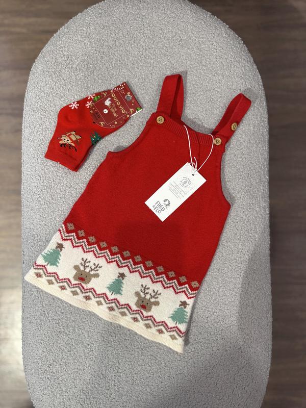 1. В наявності дитяче вʼязане плаття / сарафан для немовлят. Розмір 62, до 3 місяців. Новий, з біркою. До плаття додаю різдвяні носочки (0-12 міс.).