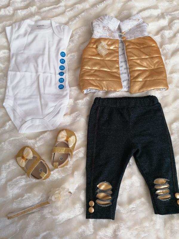 Жилетка+лосіни б/у. Стан ідеальний. Розмір 12м. Довжина жилетки 28см, довжина лосінів 35см. Білий бодік 9м новий, довжина бодіка 41см. Пінеточки нові. Довжина устілки пінеток 11см. Можна як окремо придбати, так і разом. При купівлі всього комплекту повязочка в подарунок🌼 Ціна всього разом 350грн. Ціна окремо жилетка+лосіни 220грн. Білий бодік і пінетки по 80 грн.