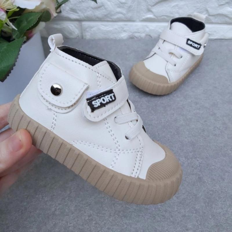 молочного кольору, верх еко-шкіра, в середині текстиль, устілка також текстильна, захищений носок від збивання, регулюються ліпучкою та шнурками-резинками. 18р устілка 12,8см 18р устілка 12,8см 19р устілка 13,3см 19р устілка 13,3см 19р устілка 13,3см 20р устілка 13,7см