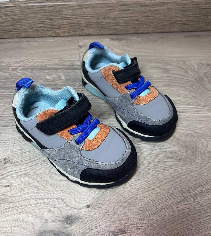 Дитячі кросівки фірми CLARKS, довжина устілки 13,5 см Верх з відповідально виготовленої шкіри та змішаної сітки надає спортивного вигляду Еластична мереживо та застібка на ript-tape забезпечують легке взування/зняття та надійну фіксацію Гумовий захисник для носка додає захисту та довговічності М'який язичок і комір забезпечують тривалий комфорт і підтримку Антибактеріальна підкладка зберігає відчуття свіжості взуття Зносостійка гумова підошва з дизайном динозаврів, зручним для дітей, використовує гнучкі канавки для оптимального зчеплення