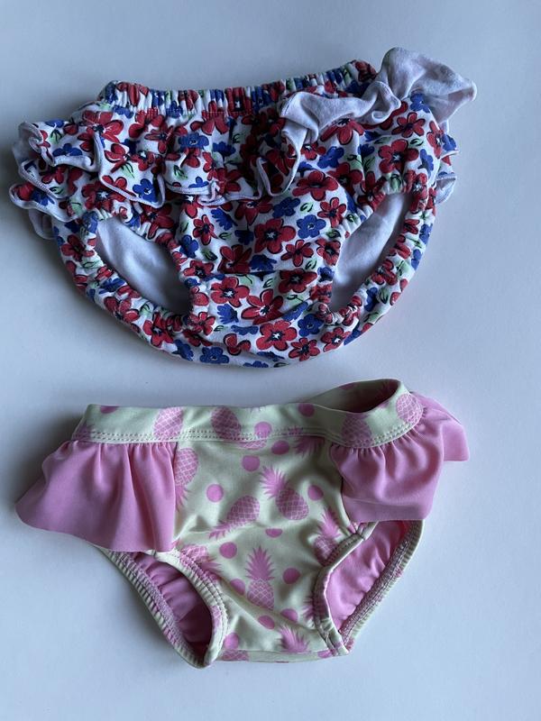 Желто розовые имеют ленты для фиксации Стан хорош, только позади имеют чуточку серую ткань от песка (на фото показала) Цена 80 грн Цветочные идеальные, заменяющие подгузник для бассейна Без недостатков, как новые Цена 100 Обидва за 150 грн