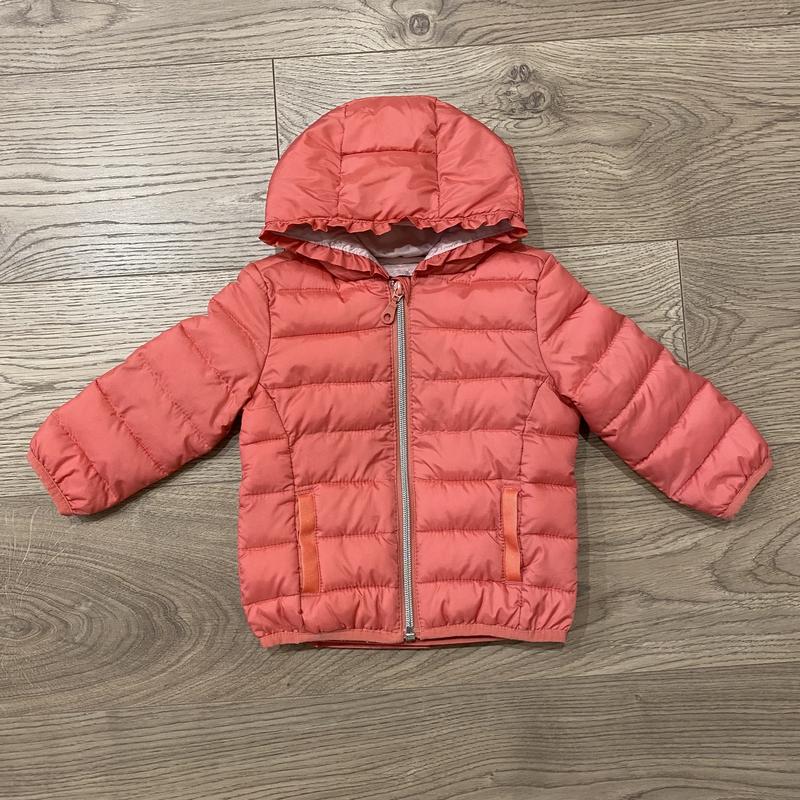 Куртка дитяча, колір кораловий. Розмір 74 (6-9міс). На спинці і на капюшоні граненьки рюшики. Заміри на фото