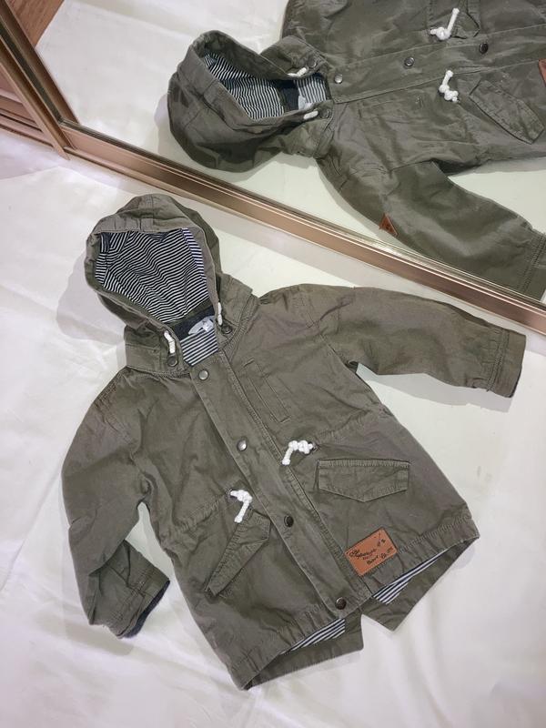 Куртка парка на 1,5 рюмки, рост 86 см. Ткань коттон, подкладка также. В рукавах манжеты трикотажные. Капюшон на кнопках. Стан - идеальный. Замеры: длина по спинке 40 см, ширина 33 см, рукав 28 см, плечо 6 см. В поясе затягивается.