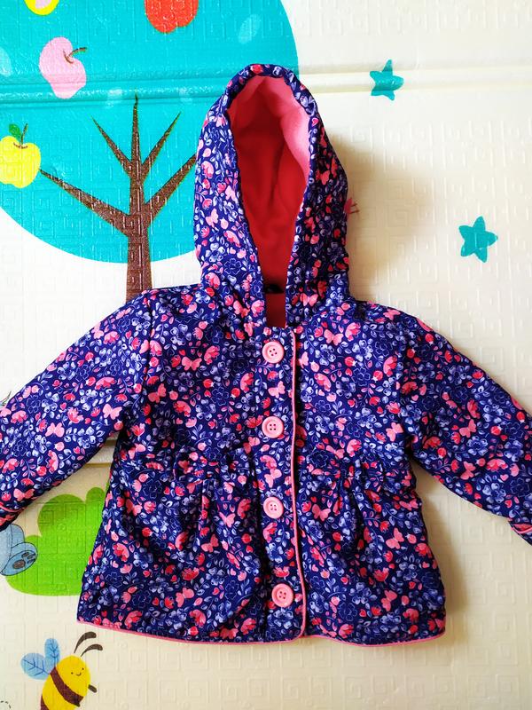 Очень красивая курточка в очень хорошем состоянии, без пятен и недостатков. Прикрашена двома бантиками. Хотя на бирке указан возраст 6-9 месяцев, переносили ее до года. Цвет как на первом фото