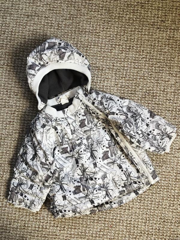 Очень классная курточка, по наборке 4-6мис, но носили до года, длиннее.от плеча сзади 35 см, спереди 33 см, рукав от капишона 30 см
