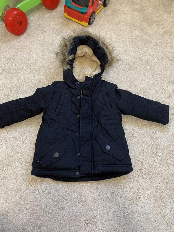 Очень теплая парка в размере 80 на 9/12 мес. Не маломерит. Стан - идеальный. Одевали два