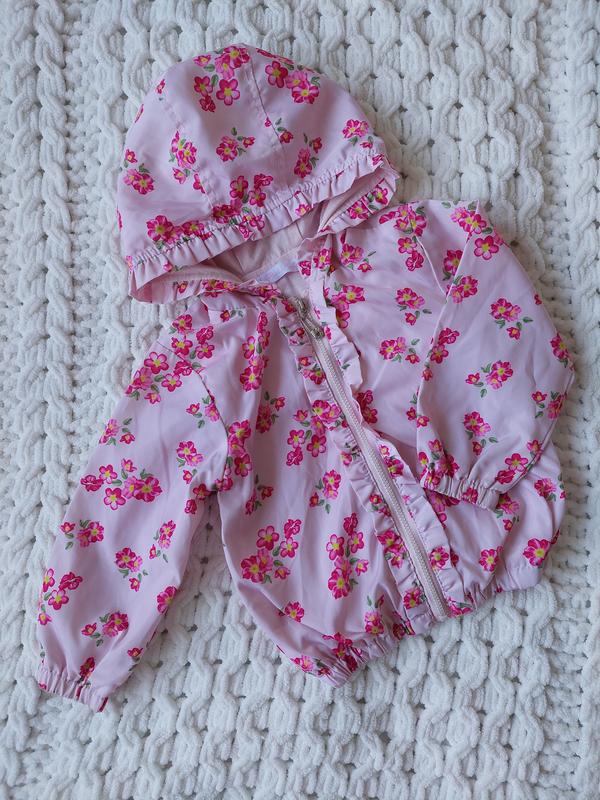 детская ветровка розовая с цветочками есть капюшон на резинке длина 34 см рукав 29 см ширина 30 см