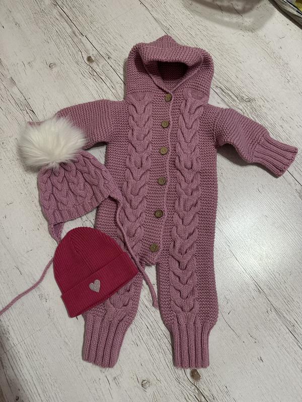 Очень красивый и качественный набор для девочки) В идеальном состоянии) В наборе две шапочки) От 7- 8 мес до 1,5 лет подойдет точно, за счет того, что вязка отлично тянется) Очень теплый и удобный))