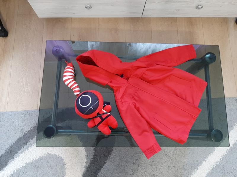 Красно-яркий плащик на замке и липучках, внутри в черный горошек, с кармашками.