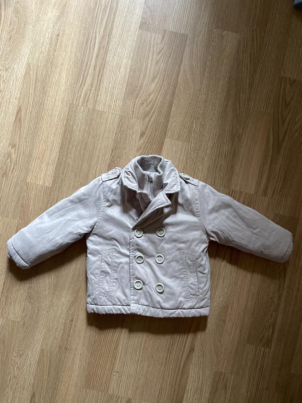 парка на тоненькому синтепоні, в середині підкладка з тканини Розмір не вказан, але орієнтовно 9/12 місяців Орієнтуйтесь по замірах: Довжина парки від плеча 35,5 см Довжина рукава від плеча 30 см Напівобхват грудей 35 см Ширина в плечах 25 см Має невеличкий дефект, відірвався ґудзик зверху де плече, на останньому фото показала. На носку ніяк не впливає, бо ті ґудзики служать суто для зовнішнього вигляду.