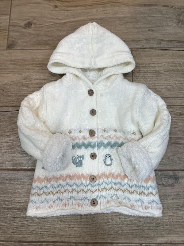 Тепленькая вязаная кофточка на фосиновом утеплении от nutmeg на 1,5-2 года (92см), кофточка с милым принтом, застегивается на древесные пуговицы, состояние идеальное