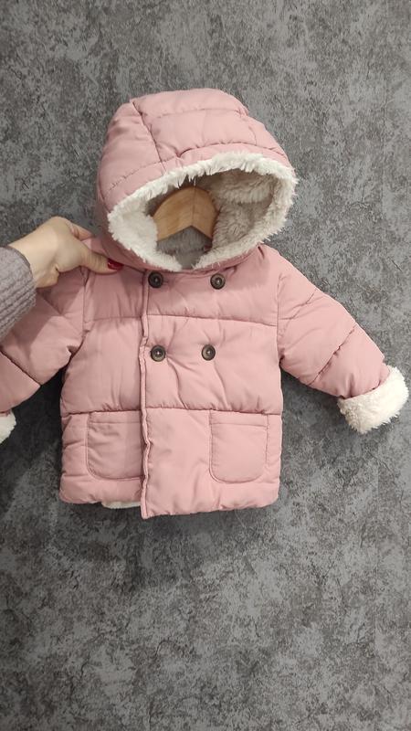 Детская зимняя куртка. В приятном пудровом цвете. На размер от 68-74, на 80 притик уже. Рукав заворачивается. Застегивается на 2 пуговички. Есть дефект, пробита шпилькой, но когда застегиваете куртку, то ничего не видно. Длина 33 Ширина 32 Рукав завернутый 26, отвернутый 30
