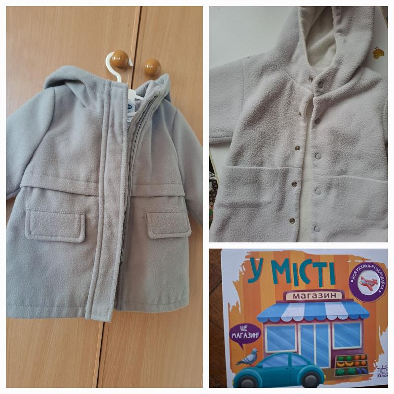 Цена за набор. Стильное красивое пальто в отличном состоянии 12-18 мес Светлое пальто более на теплую погоду. В подарок новая книжка-розкладыва!
