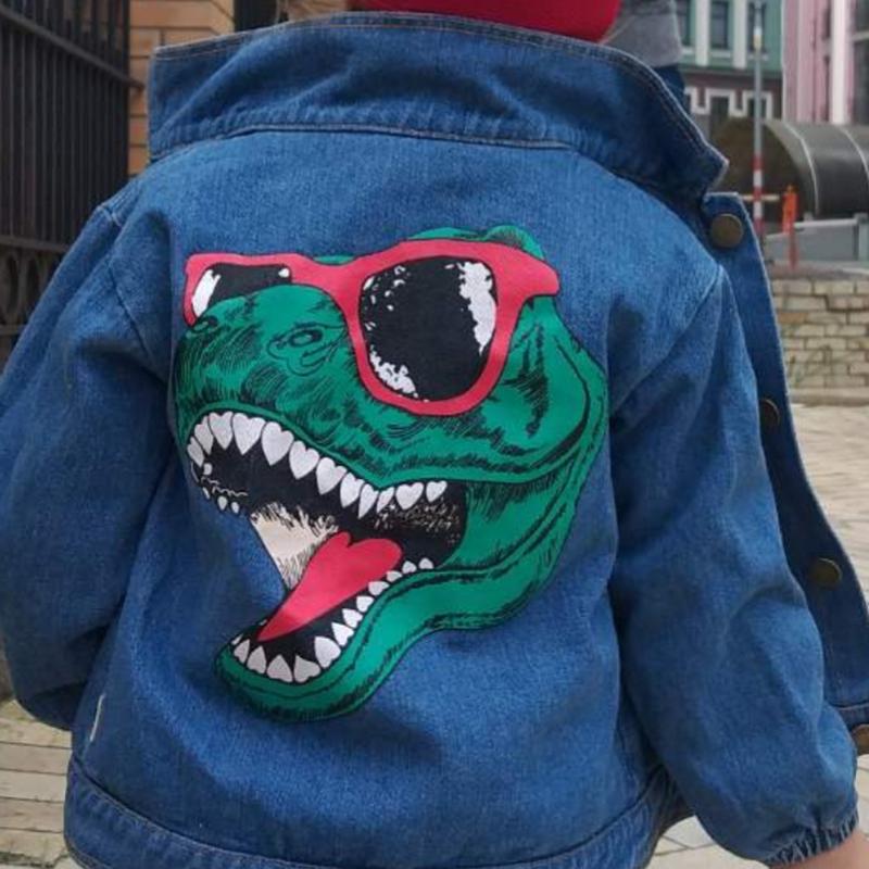 куртка джинсовая детская унисекс рукава на резинке гудзики принт в виде динозавра размер 98-104 см