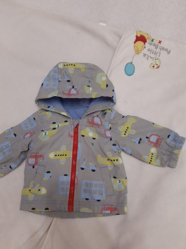 Ветровка,NUTMEG",в новом состоянии,верх-нежная плащевка-100%п&олиэстер,в середине-флис-100%полиэстер,на молнии. Размеры: Мальчику 0-3мес. Долж.от воротника к низу( по спинке)-29.5см. Длж.рукава от воротника-26.5см. Дл. рукава от плеча-21.5см. Дл. рукава (под рукой)-14см. Дл. от проймы до низа-16см. Объём-26.5сы. Талия-26.5см. Низ(пояс)ширина-25.5см. Плечи-20.5см.