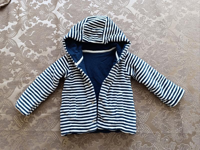 В идеальном состоянии Мягкая, теплая, на кнопках темно-синяя в белую полоску 80% хлопок, 20% полиэстер рост до 76 см, вес 10 кг на 6-12 мес длина 34 см, ПОГ 30 см