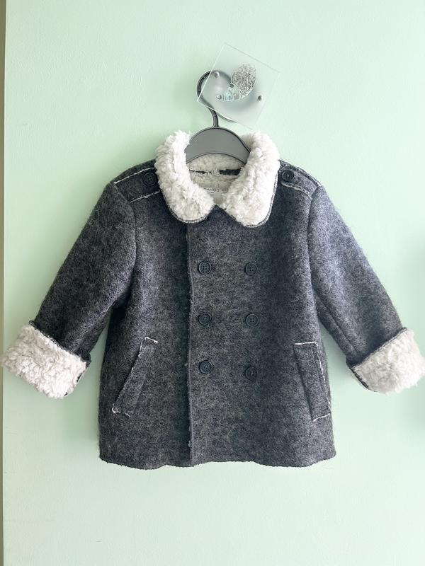 Тепле дитяче пальто на хутрі (фірма Mango). Розмір 92 (на 1,5 - 2 роки). Склад: 23% натуральна вовна, 77% поліестер. Заміри: - довжина по спинці (від плеча до низу) - 40 см; - ширина під руками - 36 см; - довжина рукава регулюється - середня 25 см, можна відвернути повністю до 33,5 см (за бажанням можна зробити менше 25 см). Універсальний фасон та колір - підійде як на дівчинку, так і на хлопчика. Нове, але без картонної бірочки.