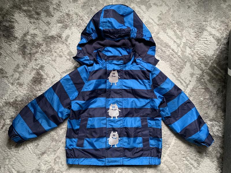 Размер 86/92 Дефекти указано на двух останніх фото. Куртка на флисовой подкладке. Капишон отстегивается. На рукавах есть липучки чтобы уменьшить. Есть светоотражающие элементы. Длина 40 Ширина 35 Рукав от плеча 34