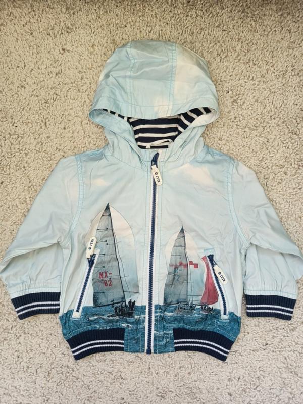 Стильная ветровка на малыша. (Next). Стан идеален. Красивое. изображение яхт. Очень красивая и стильная. Легкая. Верх - плащевка. Подкладка хлопковая. Рост 86. Длина - 33 см. ширина по спине -32 см., Длина рукава от плеча 28 см., Длина плеча - 6см.