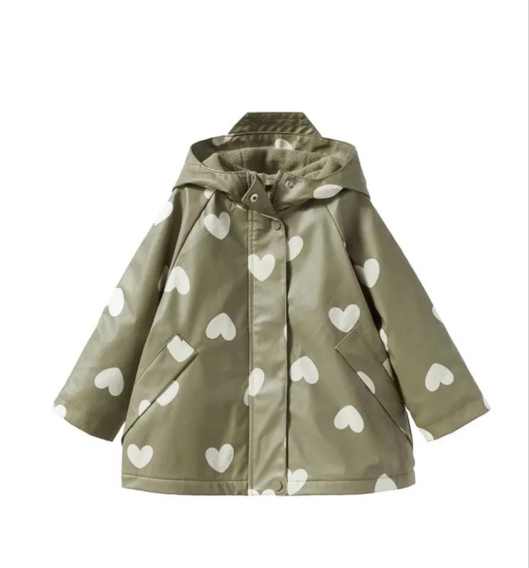 Дощовик ZARA для дівчинки Стильний дощовик від Zara, розмір 92 см (18–24 міс.). Колір – хакі з білими сердечками. Має капюшон, дві кишені та надійну застібку на блискавку і кнопки. Всередині м’яка флісова підкладка, що забезпечує тепло та комфорт. Ідеальний для дощових днів – захистить від вітру та вологи. Стан відмінний ✅