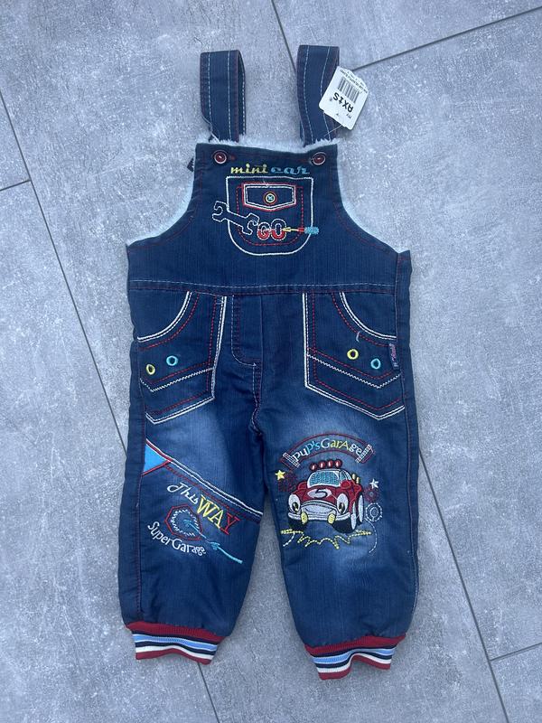 Стильний, теплий комбінезон для малюка. Довжина від початку шлейок до низу 52,5 см, напівширина під руками 27 см кроковий 26 см