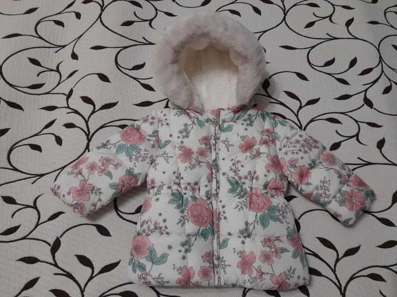 Куртка еврозима на девочку 6-9 месяцев, фирмы F&F. На синтепоне и на меху. Замеры: длина 35см, полуобхват груди 28см, gj ybpe 31cv? длина рукава от плеча 24см.