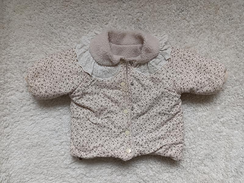 Курточка для девочки Мы носили с 3х месяцев до года Очень удобная и мягкая, не стесняет движение Осень/весна, возможно подойдет и на теплую зиму Есть маленькое пятно на воротнике и подмышью (передние фото) при носке совсем не заметны Если нужно, замеры снаряжения, пишите
