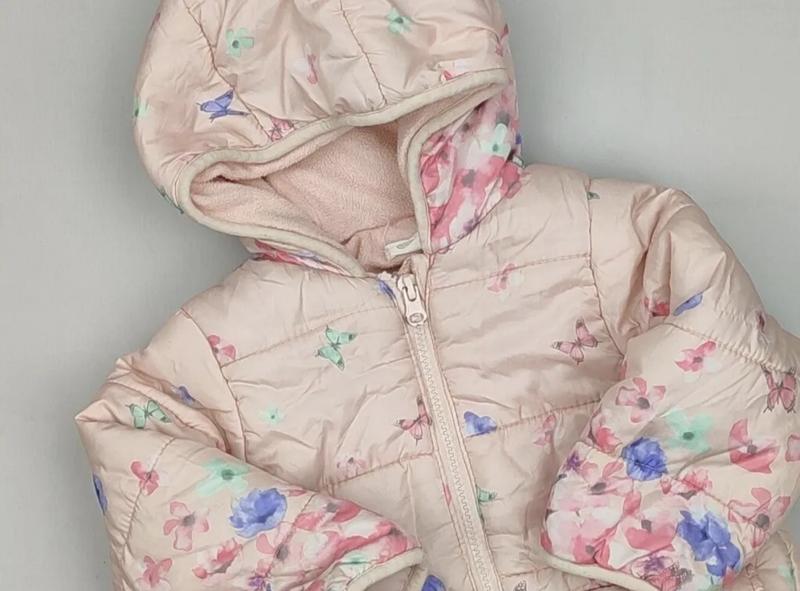 Возраст: 12-18 мес. Размер: 80-86 см Девчачья стеганая куртка с капюшоном, размер 86. Цвет: пудрово-розовый Узор: разноцветные бабочки и цветы по всей длине - Застежка: передняя молния Капюшон: несъемный, мягкая и теплая флисовая подкладка Внутренняя подкладка: флис для тепла и комфорта Карманы: два передних кармана, один с клапаном на кнопке Рукава обработаны нежной эластичной лентой для лучшей посадки Легко блестящий внешний материал, горизонтальная стеганая прострочка Идеально подходит для вашей малышки в холодные дни. Бренд: Benetton (етикетка видно). Размер 86
