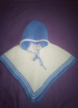 продам вязаное пончо на малышку 6-9месяцев , состояние нового,замеры: длина изделия от плеча-30,5см,длина "рукава"от горловины-20см,ширина(отугла до угла)-43,5см, капюшон-33,5см по шву