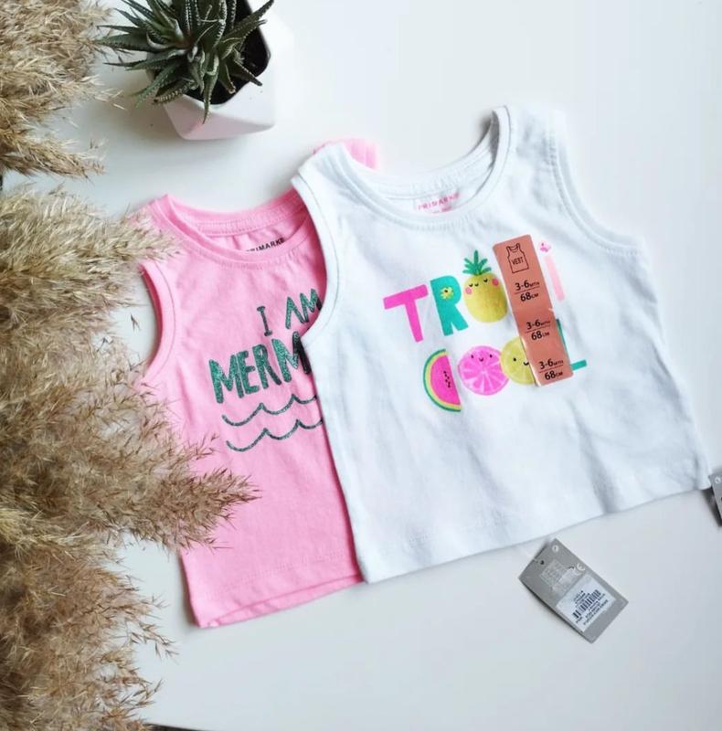 Набір маєчок для маленької красуні від Прімарк 🌱 доповнять ваш літній образ ❤️ 3-6 міс (68 р.) Більшемірять, дивіться заміри 👍 🌸 Довжина - 28.5 см, ширина - 22 см