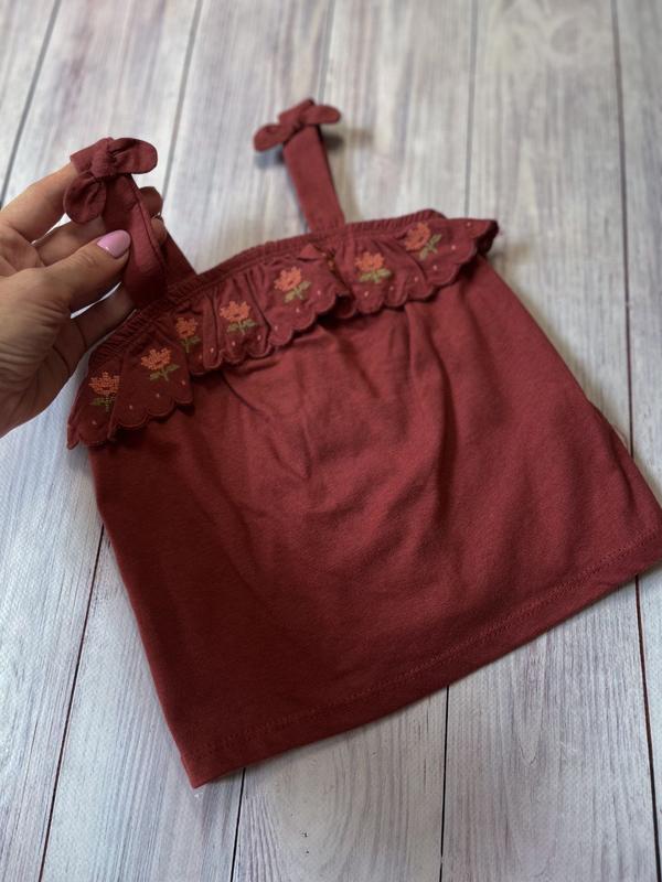 ✂️Материал: 100% хлопок🍃 📏Размер: 74-80 см ✅ 💰Цена: 100 изна 🔥 📝 Маечка на широких брителях с декоративными бантиками. По объему резинка и воланы с вышивкой цветы (тюльпаны). Eco Conception🍃