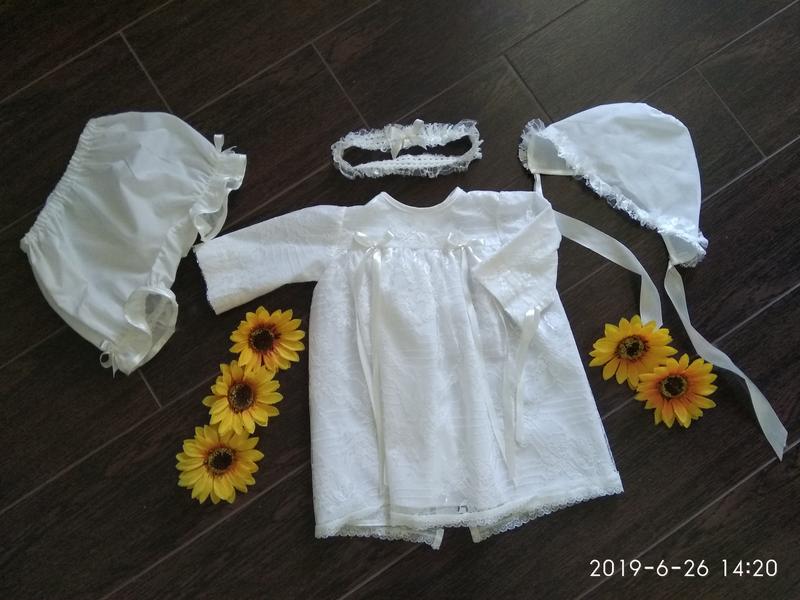 Набор для крещения Розали (рубашка, панталоны, шапка, повязка) от Battesimo от 0 до 6 месяцев. Очень нежный и нарядный набор для малышки 0-6 месяцев, подойдёт для любого праздника или крещения. Цвет Шампань. В подарок пинетки). Красивый наряд для крещения Розали порадует маленьких модниц красотой, мягкостью тканей и доступной ценой. Платье полностью покрыто гипюром, а длина рукавов регулируется атласными завязками. Милые панталончики с бантиками прикроют памперс. Длина платья 45 см (0-6 мес)