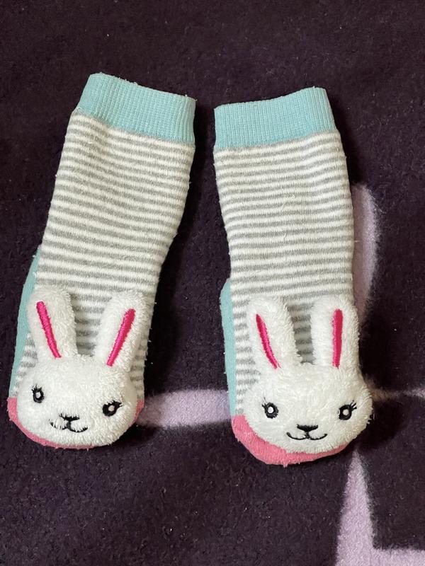 Дитячі шкарпетки з іграшкою-брязкальцем у вигляді зайчика. Знизу шкарпеток - «стопери», якщо ваш малюк вже почав ходити, то це ідеально, щоб було добре щеплення з поверхнею і він не ковзав. Заміри шкарпеток у «спокійному» стані. Підходять на ніжку до 12 см. Теплі, всередині махра.