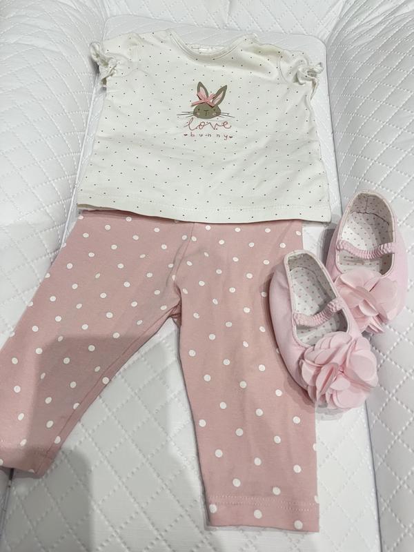 Всё в отличном состоянии, лосины одели пару раз, футболку и балетки по разу) Футболка Next, на 1 месяц. Лосины Matalan, 0-3 месяца. Балетки, 0-3 месяца, по стельке 10 см.