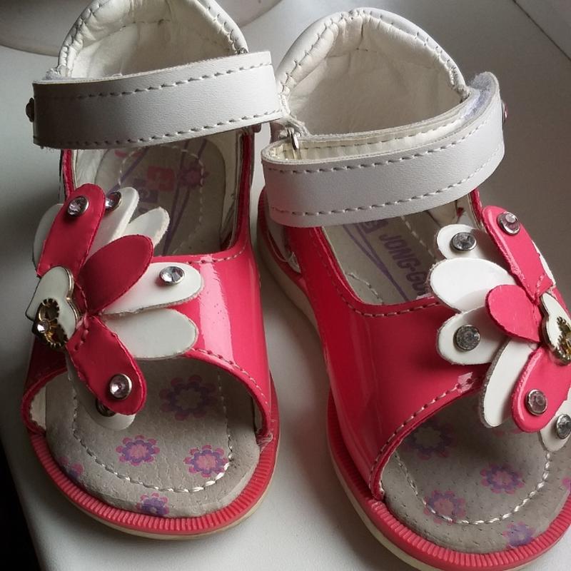 Летние босоножки, твёрдый задник, ортопедическая стелька, внутри кожа, снаружи качественный кожзам, состояние идеальное. размер 21, стелька 13 см.