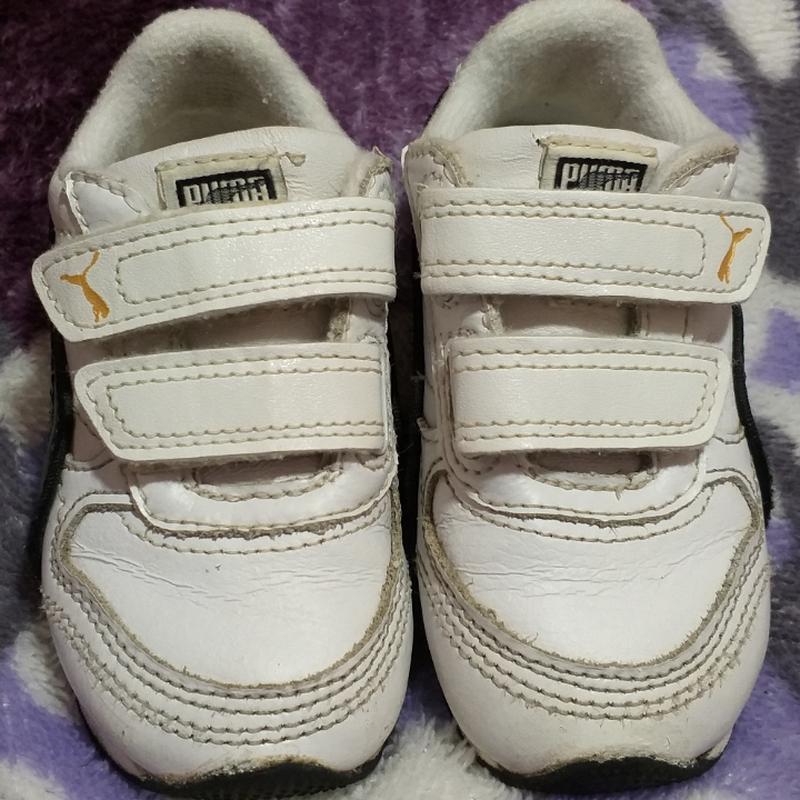 Наши кроссовки Puma, фирменные, натуральная кожа, состояние очень хорошее. Стелька 13.5 см, размер 21. Немного сбиты носки, больше нюансов нету.