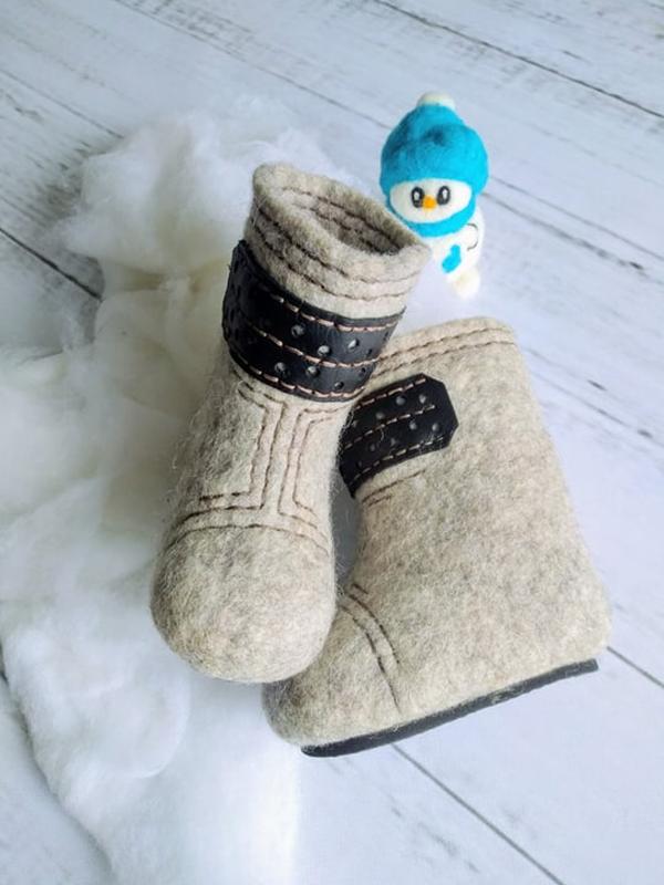 Валенки детские выполнены из натуральной шерсти, проклеены и подшиты. Носок и пяточка дополнительно укреплены войлоком. Подошва микропора.