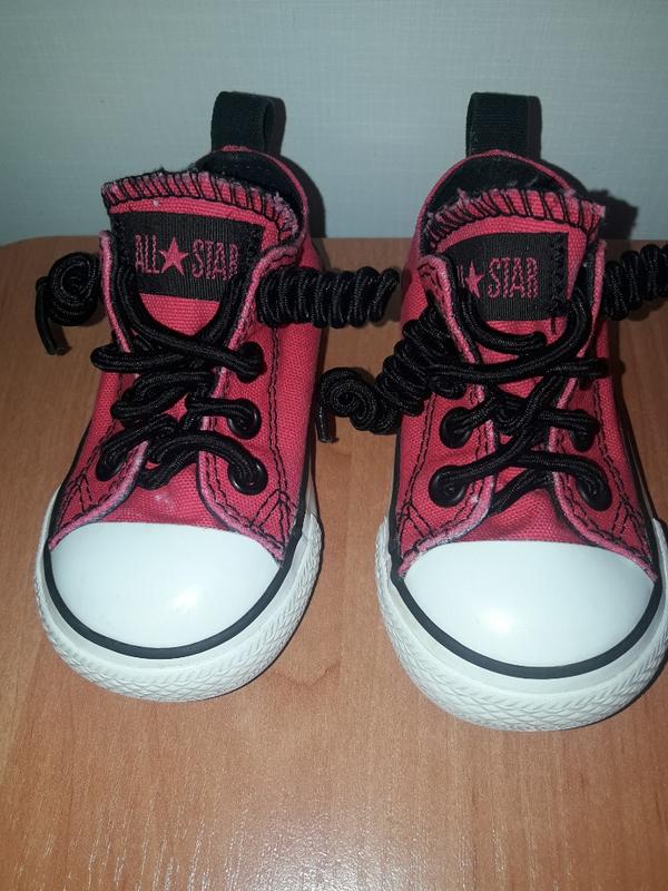 Первые кеды для крошки стиляги Яркий розовый цвет Малый вес По стельке 12.5см Следы носки незначительны Кучерявые шнурки можно заменить при желании