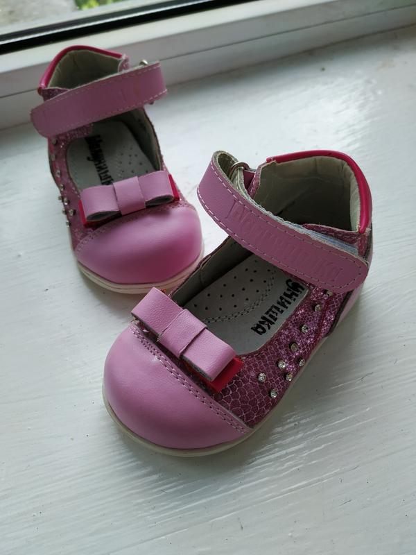 Туфли для девочки, в состоянии новых, одели всего 2 раза, абсолютно без дефектов. Ортопедические, жёсткий задник и носок, стелька с супинатором, каблук Томаса. Идеальны для первых шагов. Длина стельки 12,5 см. Материал внешний: Замш/ Кожа нат. Материал внутренний: Кожа
