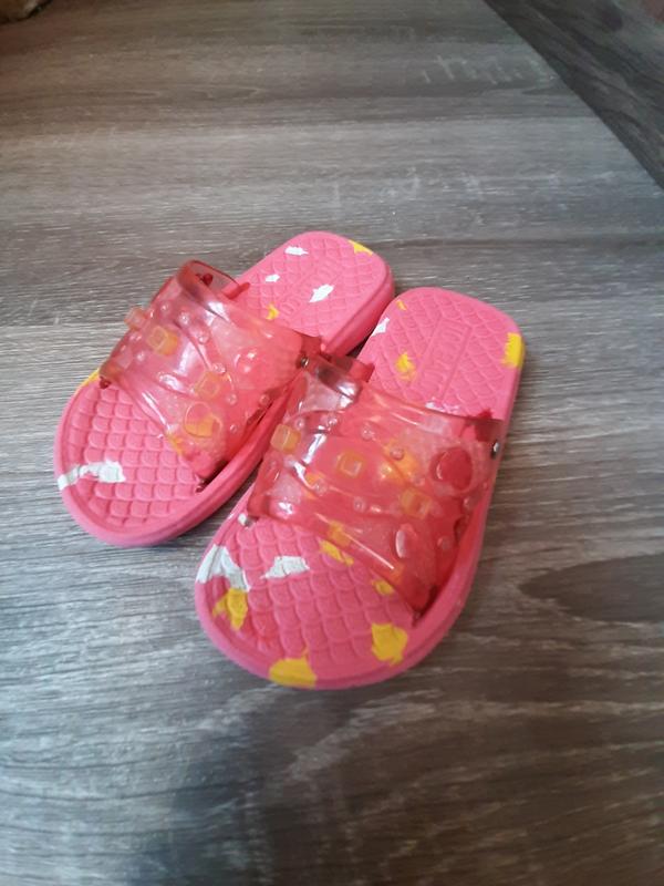Легкие шлепанцы, очень стильные, из мягкой резины с силиконовой перемычкой. Для бассейна, пляжа и прогулок. Подошва не дефформирована и не стерта. Длина стельки 13 см