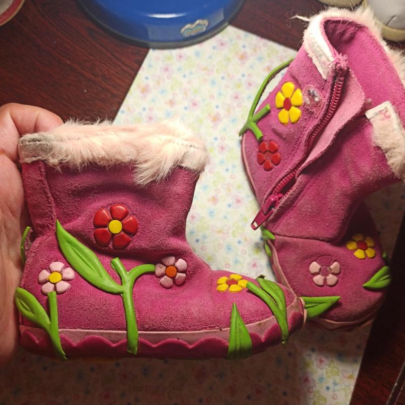очень прикольные ботиночки😍 внутри кожа сверху замш, либо очень похож на него стелька 14 см подошва резиновая, мы и по лужам в них бегали размер 21