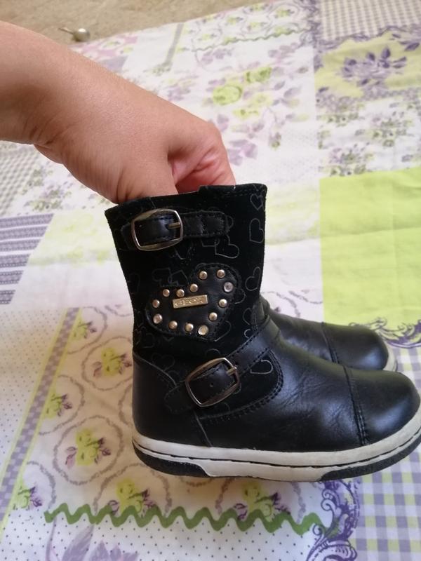 Демисезонные сапожки на девочку geox. Есть незначительные счесики. Но цена не большая. Внутри кожа. Очень удобные.