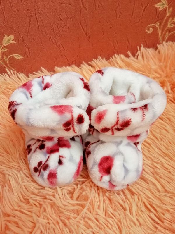 Теплі пінетки на флісі, стан ідеальний. Білі з червоними квітами, на зручних липучках. Ніжка манюні буде в теплі. Розмір 3-6,6-9 міс.