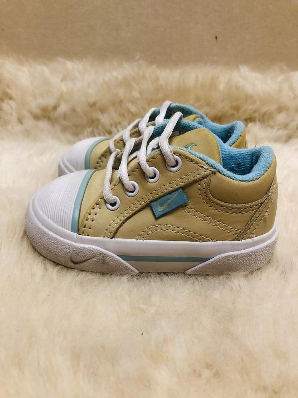Детские кеды Nike. Материал верха - натуральная кожа+резина. Внутренний материал- текстиль. Материал подошвы - резина. Размер - 19-19,5. Стелька - 10 см.