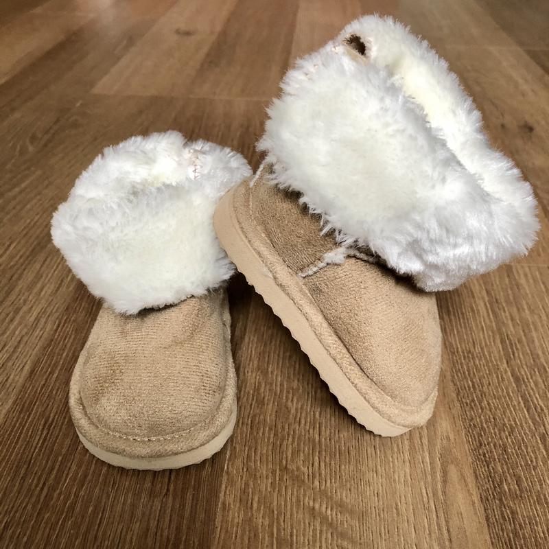 Угги новые, без бумажной бирки. Оказались ребёнку малы. Выполнены из текстиля, внутри искусственный мех, сзади угги на липучке. Подходят и мальчику, и девочке. Размер заявлен 16/17, но по факту подойдут на ножку до 9,5 см, т.к. липучка сзади немного скрадывает длину стельки.