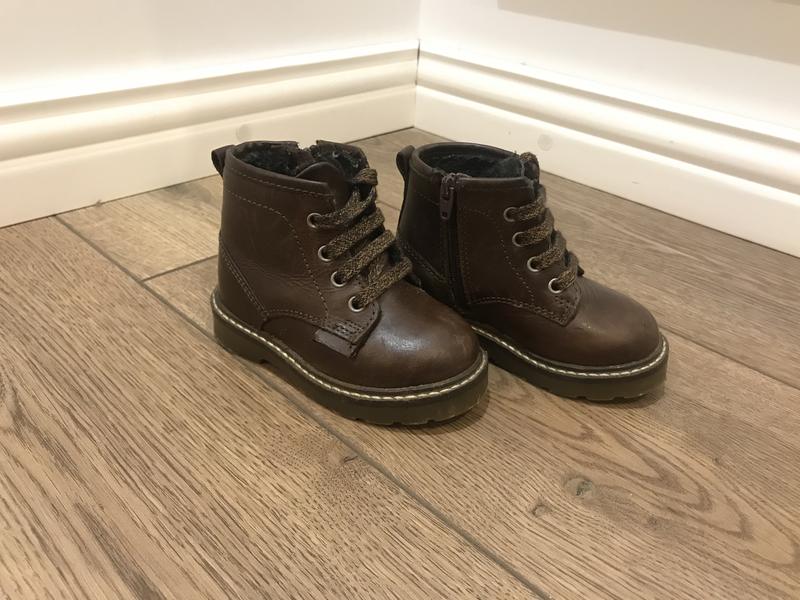 Черевики з 100% бичачої шкіри. Шнурівка, застібка на блискавку збоку. Підкладка і стель з 100% бавовни. Довжина по устілці 12,3 див. У відмінному стані.