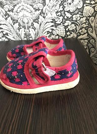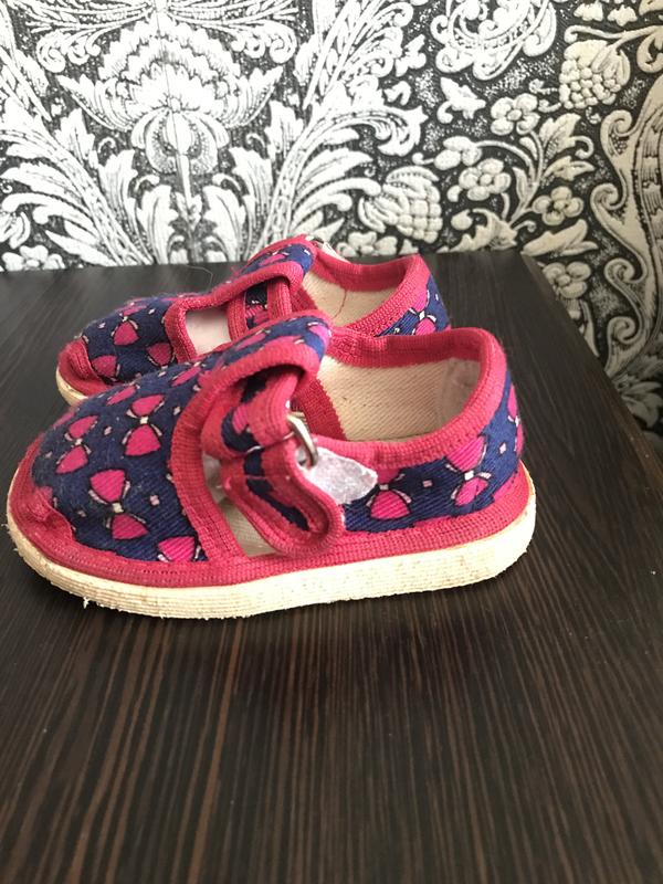 Летние сандали для самых маленьких, очень легкие и удобные, размер не указан, смотрите замер по подошве, но учитывайте, что подошва немного шире плюс край обстрочен на ткани, где-то 1 см убирайте, из нюансов, на левом сандале немного порвалась ткань, в цену учтено, а так в очень хорошем состоянии, малышка носила когда ещё не ходила