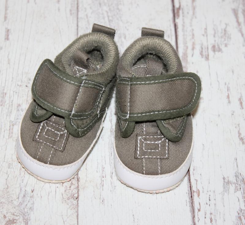 Пинетки цвета хаки для малышей в идеальном состоянии. Размер: 16 (длина стельки 9,5 см). Липучки плотные. Есть декоративные строчки белого цвета. Подошва в прорезиненных точках. Для возраста до 3 мес. Внешняя ткань - соттон, внутрення - флис.